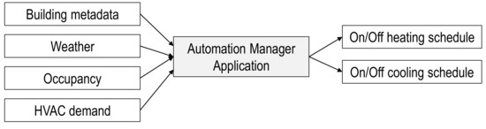 To maximize overall system energy efficiency, the energy manager also interacts with an automation manager application for which the main goal is to manage in an optimal manner all the controllable devices available in the buildings’ premises, such as heating, ventilation, and air conditioning (HVAC) systems and thermal loads, taking into account equipment technical restrictions, comfort level, and indoor air-quality requirements.