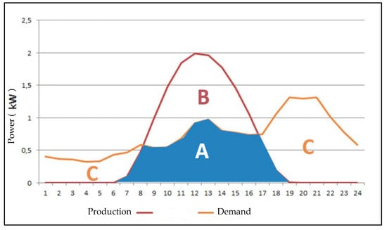 The integral of area “A” in Figure 3 corresponds to 42.86% consumption and 54.33% electricity generation. Area “C” corresponds to 57.14% consumption. Finally, area “B” corresponds to 45.67% of the total energy generated by PV installations. Considering the national production and demand average, 36.03% consumption will be offset by surplus production, and 21.11% will be consumed by other utilities connected to the grid.