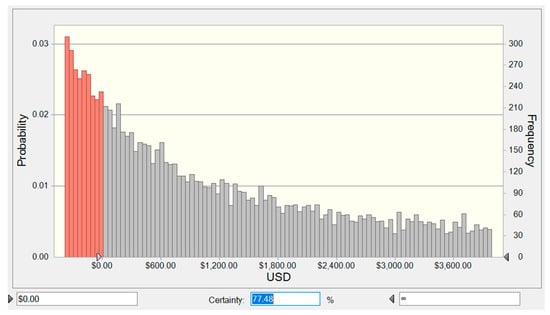 Another stochastic analysis was carried out, varying the discount rate between 6.5 to 20% for the Brazilian scenario (BR) characterized by average prices, solar radiation, and demand in the country. The objective of the study was to carry out a sensitivity analysis and to identify the range of the rate of return in which investments in PV micro-generation are still viable. Figure 10 presents the results of this simulation. The probability of viability is 77.48%.