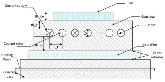 The conduction heat transfer resistance is shown in Equation (9). thc,d is the distance between the bottom of the coolant pipe and the bottom of the concrete. kcon is the conductivity of the concrete and krink is the length of the ice rink. st represents the pitch space between the pipes.