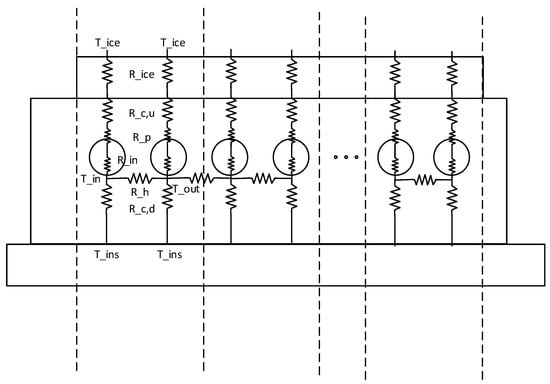 Another important heat transfer is from the bottom of the concrete to the coolant pipe, which is shown in Equation (8). In the equation, Tins stands for the temperature in the insulation material, Tin is the supply coolant temperature, and Rc,d represents the thermal resistance from the pipe to the insulation material.