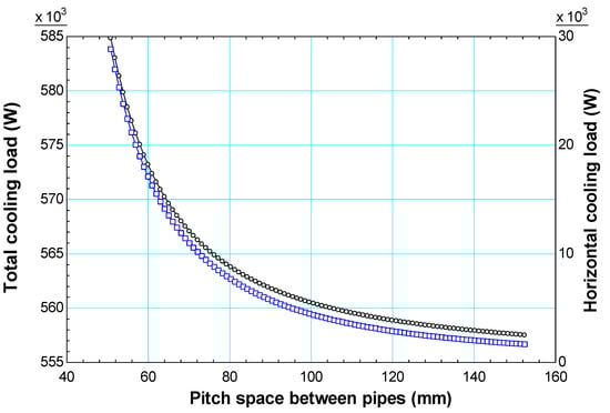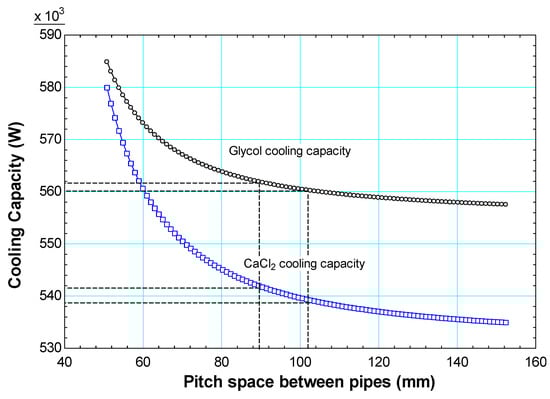 Figure 10 shows the cooling capacity comparison with 30% glycol and 20% CaCl2 water solution. The pitch between pipes varies from 50.8 mm to 152.4 mm (2–6 inches), while the remaining of parameters stay same. The glycol pipe performance is always better than the brine water performance. With the same geometry of the secondary coolant piping, the same amount of the coolant delivered through the system, and a similar velocity, the cooling performance still varies significantly because of the distinctive properties of the fluids.
