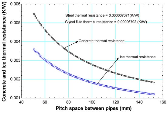 The last portion of the heat transfer happens between the supply glycol pipe and the return glycol pipe. This expression is shown in Equation (10). The horizontal conduction resistance through concrete to the pipe is shown in Equation (11). This has a similar format as the conduction up to the ice surface.