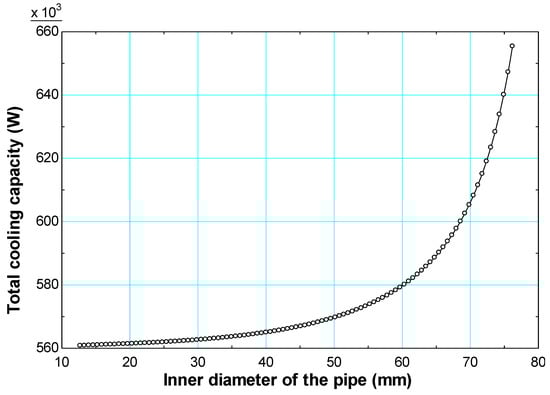 The tube inner diameter is also a crucial parameter for the cooling capacity. Figure 7 demonstrates the total required cooling power with the change of the inner diameter of the pipes. The pitch of the secondary coolant tubes is usually set at 89 mm or 102 mm. The cooling capacity is around 560 kW with 13 mm inner diameter tube. It does not increase significantly until the inner diameter reaches 70 mm. With these results, one might consider using 13 mm inner diameter tubes to create the ice rink; however, smaller pipes would require more pump power and more pressure loss, which might increase the operational cost in the future. Therefore, it is recommended to use 25 mm or 38 mm diameter tubes for the best practice application. This shows that the cooling capacity does not change significantly (around 560 kW) with 25 mm or 38 mm tube inner diameters as long as the other geometry parameters and operational characteristics remain the same.