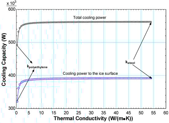 In Figure 8, the carbon steel has a high thermal conductivity of 54 W/(m×K) and, therefore, has better heat transfer performance. The polyethylene has a low thermal conductivity of 0.33 W/(m×K) and worse heat transfer characteristics. Figure 8 shows the cooling performance map for different material tubes. With the same configuration, the carbon steel pipe could deliver 560 kW cooling, while the polyethylene tube can only deliver 491 kW cooling. However, in Figure 8, the cooling curve has a relatively steep slope at low thermal conductivity values less than 1 W/(m×K). The cooling power goes to a steady state around 560 kW as long as thermal conductivity rises to 5 W/(m×K). Consideration could be given to using a type of pipe which has less thermal conductivity than carbon steel but has thermal property of at least 5 W/(m×K). This is a good selection from a thermal efficiency perspective. Nevertheless, designers also need to consider the capital cost, maintenance, lifetime operation, etc. for the pipe material selection. Therefore, the carbon steel pipe may be the best practical selection for the ice rink application.