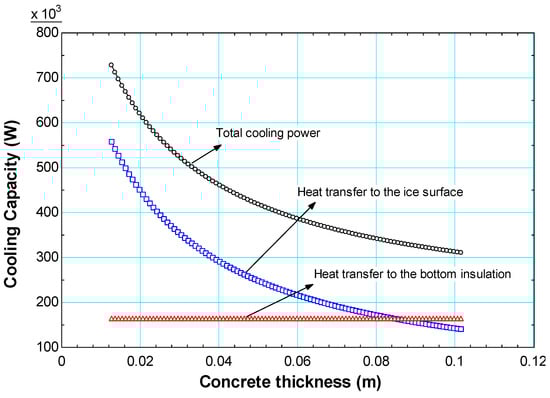 The concrete between the pipe and the ice is another thermal resistance for the ice rink. The function of the concrete is to hold the ice and produce a flat surface for the rink. This also inherently creates the thermal resistance between the coolant pipe and the ice rink. Figure 9 shows the cooling performance of the ice rink with different concrete thickness. As the thickness of the concrete increases from 13 mm to 102 mm, the total cooling power drops from 735 kW to 315 kW. The thicker is the concrete layer, the less cooling power is received from the coolant pipe. The typical ice rink requires approximately 560 kW cooling; therefore, the reasonable concrete thickness is around 25 mm. The change in the thickness does not affect the horizontal cooling or cooling transfer to the bottom of the concrete, as shown in Figure 9.