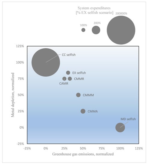 Relationship between system expenditures, GHG emissions, and metal depletion. The marker area is proportional to system expenditures. The GHG emissions and metal depletion are normalized to the range between the utopia and nadir points, 0–100%.