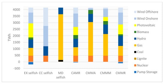 Consequently, six scenarios are defined in the following policy package. These are: (1) CC ambitious and MD ambitious (CAMA), (2) CC ambitious and MD moderate (CAMM), (3) CC ambitious and MD relaxed (CAMR), (4) CC moderate and MD ambitious (CMMA), (5) CC moderate and MD moderate (CMMM), and (6) CC moderate and MD relaxed (CAMR). For comparison, the results obtained from single objective optimizations are often called selfish scenarios [35]. These are EX selfish in case of minimizing the system expenditures, CC selfish for minimizing the GHG emissions, and MD selfish for minimizing metal depletion. Table 1 summarizes the definition of the three selfish scenarios and the six policy package scenarios with different decision-making preferences.