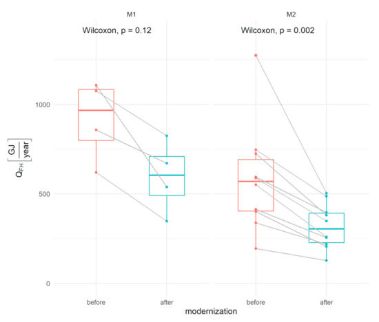 The analyzed material was tested for differences between energy consumption (expressed by QFH, FEH and PEH indexes) before and after thermal refurbishment. Basic descriptive statistics such as minimum, maximum, mean, median and standard deviation were estimated. Boxplots illustrating the distributions of the replacement were also used. The significance of the differences was verified using the Wilcoxon test for dependent variables [43], which is a non-parametric equivalent of the Student’s t-test. The choice of the test was dictated, firstly, by the relationship between the measurements before and after thermal refurbishment and, secondly, by the lack of meeting the assumptions about the normality of the distribution of the studied features in the groups and the lack of homogeneity of variance. In such a situation, it was reasonable to use this test [44].