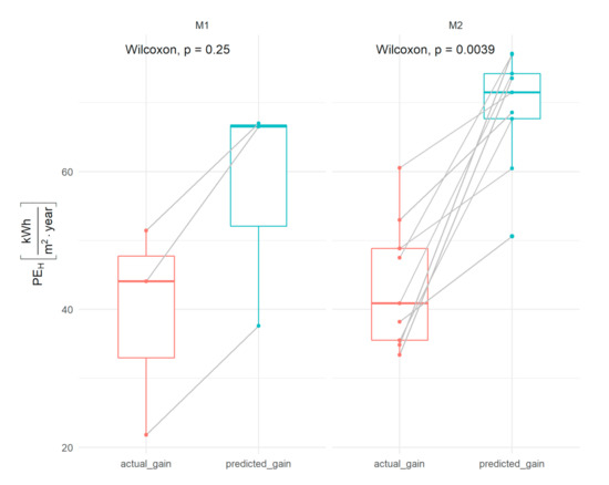 Although in the M1 group the significance of the differences was not statistically significant (p = 0.12), which most likely results from the fact that a small sample size was used for testing, in all analyzed cases, there was a decrease in energy consumption. The estimated values of energy savings for heating obtained under operating conditions are in each case lower than the forecast calculated in the energy audits. The decrease in final energy demand calculated in audits based on commonly used European standards and in conjunction with the methodology in force in Poland was much greater (Figure 3) and ranged from 37.6% to 77.1%. It should be noted that these values are forecast values and are calculated assuming the standard boundary conditions of the internal environment in rooms and the external environment surrounding the building’s balance zone before and after thermal retrofitting. This is one of the basic assumptions of the methodology of preparing an energy audit of a building. The results obtained in this study confirm the general trend observed in thermal restoration of buildings. According to the literature concerning multifamily buildings in Poland, the actual energy savings range between 8.8% and 74.8% of energy savings calculated in audits, depending on the various renovations [35]. In another paper, the economic effects resulting from thermal refurbishment of schools were compared after several operation seasons and were calculated (59–71%), and real savings (33%) differed significantly [37].