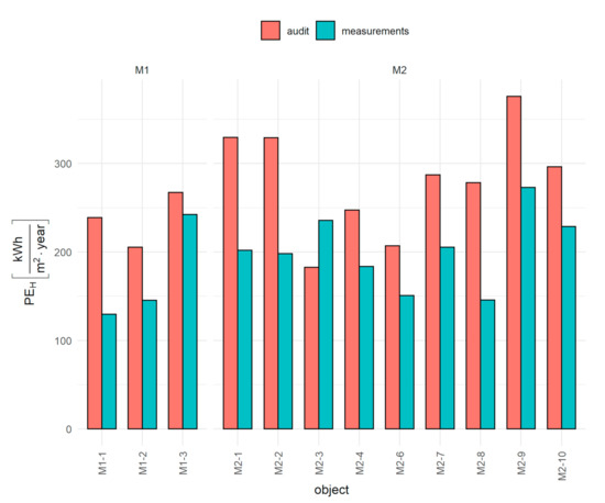 To try to explain this, the PEH index obtained on the basis of measurements in operating conditions with the same index calculated in the building energy audit was compared in 12 buildings (in two the audit results were not available), in the condition before thermal refurbishment (Figure 4). The comparison of the values of the PEH index shows that in eleven cases examined in this respect, they were higher in the audit than in the operating conditions. These differences ranged from 9.4% to 47.7%, and the average for both groups was 26.1%. It turned out that in the examined group of buildings, only in the case of M2-3 were the theoretical values of the indicator describing the energy performance of the building lower than the results obtained on the basis of measurements. In the remaining cases, these results were much higher, as presented in Figure 4. It should be assumed that before the thermal retrofitting, the buildings were heavily underheated, and the standard indoor air temperature was not reached in the rooms. This means that the thermal needs of the building were not fully covered in the conditions before thermal refurbishment, so the level of final energy savings achieved in operating conditions was lower than the forecast calculated in the audit. The final effects of energy savings are influenced by user behavior, as evidenced by literature reports [51], especially the use of control fittings of radiators (thermostatic valves) and programming of internal temperature. However, this influence of individual behavior is greater in residential buildings than in public buildings, where one person is responsible for energy management.