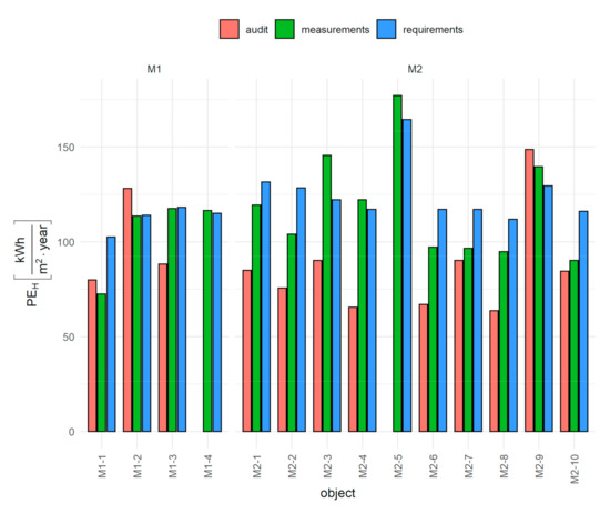 Figure 4 presents the comparison of the actual values of the obtained PEH index with the calculated values included in the audits before the retrofitting.