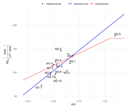Figure 6 aims to better illustrate the relationship between the required PEH,0 values depending on the building shape factor (A/V), and the values obtained on the basis of measurements. The continuous red line indicates the required values of the index at a given value of the A/V ratio, while the points on the graph show the average values of the PEH index obtained after the thermal refurbishment of the building. Additionally, the relation between the building shape ratio and Annual Primary Energy Consumption Index for Heating PEH was checked. From the diagram, it can be noticed that after the refurbishment, the values of PEH index were in most cases lower than required. It was noticed that in the case of low A/V ratio values, the influence of building shape was not significant for PEH. Hence, it can be interpreted that analyzed buildings functioned differently, and some of them could be underheated before the retrofitting. In the case of the high value of A/V ratio (building M2-5), energy consumption expressed as Annual Primary Energy Consumption Index for Heating PEH was higher than in other cases and exceeded the required PEH,0 index value, which may result from both building shape ratio and the manner of operation. These relations are similar to those previously described in the literature [7].