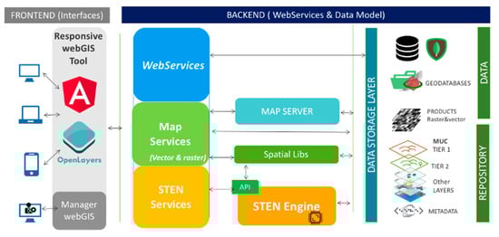 During the second phase, the prototype was developed. Its construction was carried out through agile management processes based on incremental life cycles to achieve a progressive growth of functionality. The prototype is based on the user requirements analysis, the construction of a mockup to ease interaction with users, the collection of information and elaboration of basic layers for the data model, and the development of the STEN tool for the calculation of the sustainability indicators. The webGIS tool prototype is a distributed information system with at least one server and one client, where the backend is a GIS server, and the front end is a webGIS client that runs in a Web browser. The architecture of the system is based on a client-server. The frontend includes the interface of the map, the form tool for STEN, and a representation of outputs. The map viewer allows displaying the information of interest and using that information to perform simulations of the MUC lands registered in the system. The map viewer core functionalities for layer management, layer editing, visualisation, and data management strategies were developed. The backend is made up of the set of web services, libraries, and calculation engines that implement the logic of the system, as well as the data storage layer (Figure 2).