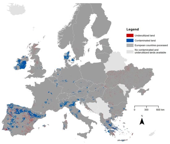 The overall mapping results for both underutilised and contaminated lands according to the methods explained above are shown in Figure 3. There are large areas of contaminated lands, specifically in Spain, Ireland, Denmark, Italy, and Greece. This results from the procedure mentioned in Section 2.3.1 in relation to the rough input data and varying national thresholds. Thus, these results should be treated with caution. However, this was the only feasible approach to integrate contaminated lands in a European-wide map because national maps are rare and/or often subject to confidentiality.