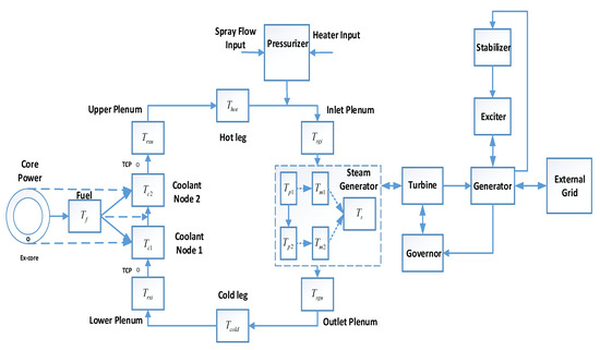 The transient analysis of interactions among different systems has been considered by a few studies in nuclear engineering literature. In the earliest works [2,3,4], the protection of nuclear power plants has been discussed; however, the mutual influences between the nuclear power plants, grid, and their protection systems have not been sufficiently considered. The conventional models of nuclear power plants proposed therein have high computational complexities, which further limited their suitability in large-scale power system dynamic simulations. Linear nuclear power plant models have been employed for short-term stability investigation of the power system for a slow and small range of output variations [5,6,7,8,9,10,11,12,13]. In these works, the subsystems are given by simplified dynamic equations, which make them preferable in short-term dynamic analysis during small power imbalance conditions. They assume that the excursions in power system frequency and voltage are due to small system disturbances. Thus, the models are not sufficient for long-term dynamics analysis and are inadequate in the case of large disturbances. Moreover, they do not represent the detailed dynamics of a nuclear power plant.