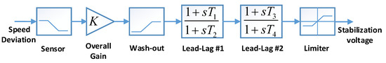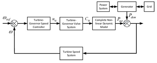 The control loop structure of the turbine-speed system is depicted in Figure 2, in which the speed can be controlled using a turbine-governor valve. The valve regulates the steam flow to modify the speed [25,26]. The PI controller output of the configuration can be stated as follows: