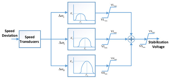 Multiband PSS (MBPSS) adjusts the working band to control different modes of oscillations. It separates the incoming speed deviation signal of the synchronous machine using three separate filters, high-pass, intermediate-pass, and low-pass filters, into high, intermediate, and low-frequency modes of oscillations, respectively [33]. The block diagram of MBPSS is shown in Figure 4. The MBPSS examines the stability in local-mode, inter-area-mode, and global-mode of oscillation. In the local-mode, the oscillations occur between a unit and the rest of the generating station, and it is dealt with using the high-pass filter. The inter-area-mode oscillations occur between two groups of generation plants, and they are dealt with using the intermediate-pass filter. The global-mode oscillations take place in all the generators in the isolated power system, and they are dealt with using the low-pass filter. This is in direct contrast to the GPSS, which focuses only on the local-mode instability of the system. Finally, the outputs of all three bands are summed and passed through an output limiter to produce the MBPSS output signal.