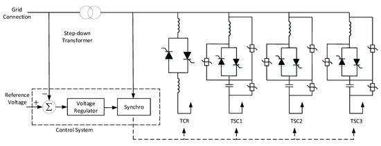 The static var compensator (SVC) is a shunt-type device regulating the voltage and power flow and can enhance the transient stability on power grids. According to the system reference voltage, the SVC either injects or absorbs reactive power to regulate the voltage on the network. The SVC provides reactive power to the system and acts capacitive if the system voltage is lower than the reference voltage. On the contrary, the SVC absorbs reactive power from the system and acts inductive if the system voltage is higher than the reference voltage [35]. A simplified single-wire circuit diagram of an SVC using the thyristor controlled reactor and thyristor switched capacitor is illustrated in Figure 5. The SVC system comprises banks of three-phase capacitors and inductors that are linked to the secondary side of a coupling transformer. The regulating system of the SVC comprises a pulse generator, a synchronising unit, a voltage measurement unit, a voltage regulator, and a distribution unit.