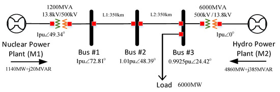 Here, the behaviour of the nuclear power plant and different network variables is studied in the presence of single-phase and three-phase faults. The behaviour of the plant is also studied following a permanent load-loss event. Figure 7 shows the line diagram of an electric grid with two generators that have a total electrical power generation capacity of 7.2 GW. The nuclear power plant (M1) has a 1.2 GWe capacity, and the hydro power plant (M2) has a 6 GWe capacity. The values of the parameters of all components of the model are given in Table A2 of Appendix A.