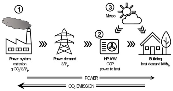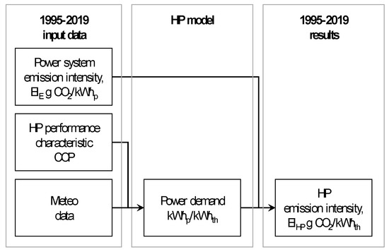 - EIHP—CO2 emission intensities of heat pump per unit of produced thermal energy, g CO2/kWhth;