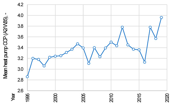 - In scenario S2, the heat pumps’ coefficient of performance (COP) was fixed at the 1995 value. The calculated CO2 intensity of heat pumps reflects two different situations. First, the emission effect of a heat pump installed in 1995 operating on the recorded ambient air temperature (te) and powered by electricity with historical CO2 emission intensity changes (EIE). Finally, the lack of progress in heat pumps technology was simultaneously determined.