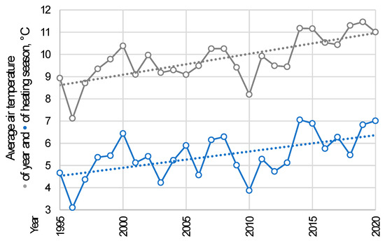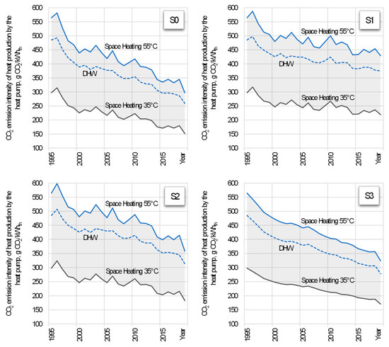 - In scenario S3, the ambient air temperature (te) impacting the heat pump COP was fixed at the 1995 value. The CO₂ emission tendency followed the real 1995–2019 changes in power sector emission intensity and technological development of heat pumps. The S3 scenario demonstrates the influence of factors other than ambient air warming as a hypothetical value that could have been achieved if the goals relating to climate change had been implemented earlier. Simultaneously, it includes the consideration of only direct influence factors displaying the results of active improvement.