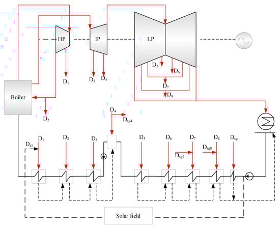 - Hongjuan, H.; Zhenyue, Y.; Yongping, Y. Performance evaluation of solar aided feedwater heating of coal-fired power generation(SAFHCPG)system under different operating conditions. Appl. Energy 2013, 112, 710–718. [Google Scholar] [CrossRef]