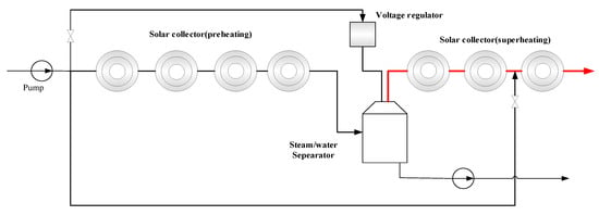 The detailed flow of the working fluid is as follows: the outlet water of the condensate pump is pressurized by the pump so that the pressure of the water is kept under the design pressure of the inlet of the preheating section; then, after heating in the preheating field, the outlet water temperature is maintained to be equal or slightly less than the saturation temperature under the outlet pressure, and then flows through the flash tank. As the working pressure of the flash tank is lower than the outlet pressure of the preheating field, the inlet water temperature is higher than the saturation temperature under the working pressure of the flash tank, so the water will vaporize. The steam generated is sent to the overheating field, and the drain water is pressurized by the drain pump and transferred to the heat regenerative system or drainage system of the coal fire unit. It should be noted that the outlet water pressure of the preheating section is maintained at 10 Mpa in this paper. The structure diagram of the solar field is shown in Figure 2.