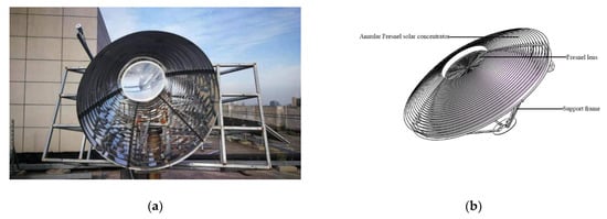 Details of AFSC (a) Structure of the annular Fresnel solar concentrator (AFSC) and (b) schematic diagram of the AFSC [28].