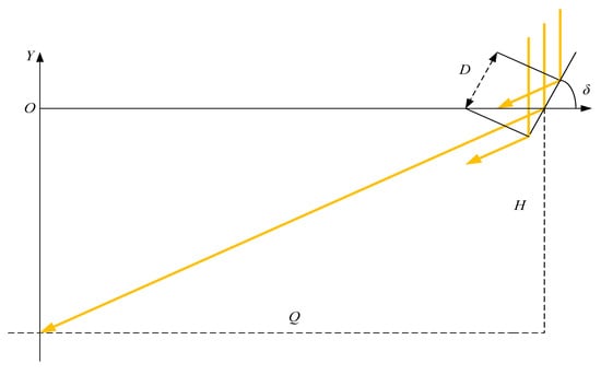 As shown in Figure 4, is the angle of the mirror, is the height from the center line of the mirror to the horizontal ground, is the horizontal distance from the center of the mirror, and is the width of the mirror. The detailed modeling method is shown in [28]. The main parameters of mirror are and , and the relationship between these three parameters is as follows: