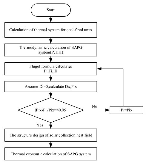 Through the above analysis, this paper uses Matlab software to carry out modeling and simulation when the solar radiation is 800 W/m2. The calculation flow chart is shown in Figure 6. First, the thermal system of the original coal-fired unit is calculated, and the outlet parameters of condensate pump and the extraction parameters of a certain stage are set as the inlet and outlet parameters of the solar field, respectively. Then, the structural design and calculation of the hybrid system is carried out. Next, the outlet parameters of the solar field are brought into the hybrid system to calculate the extraction quantities at all stages. Owing to the introduction of solar steam extraction here, the overall extraction parameters of the steam turbine will be changed, so the extraction steam pressure Pi, enthalpy, drainage enthalpy, and feed water enthalpy must be recalculated. Then, assume that the substituted stage steam extraction quantity is 0, calculate the solar steam flow rate and the steam extraction flow rate Dx and pressure Pix at all levels, and compare Pi and Pix. If the pressure change is more than 5%, make Pi = Pix and begin the variable condition calculation again. When the pressure change is less than 5%, the structure of the solar field is calculated by the above values. The specific method of the structure calculation is to calculate the area of the solar field and other aspects according to the aforesaid inlet and outlet parameters at certain time, such as the solar radiation intensity of 800 w/m2, ambient temperature, and wind speed.