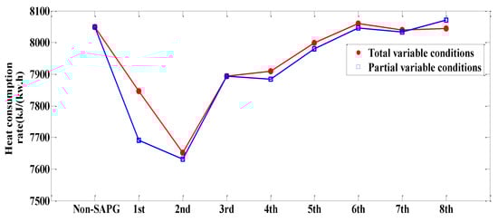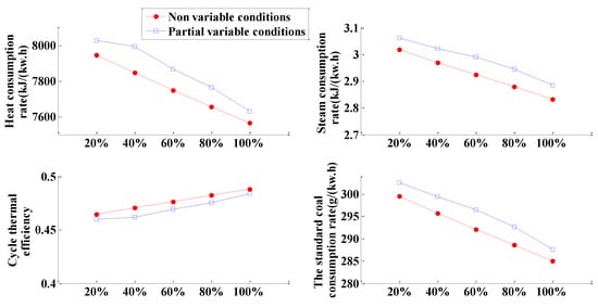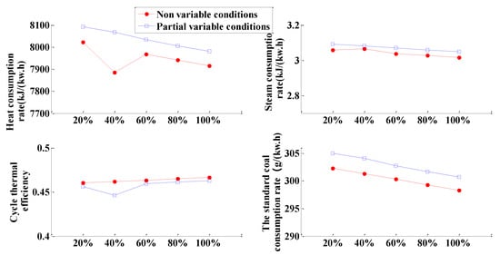 The heat consumption rate of power generation is given by Equation (22) and calculated by Equation (21). is the boiler efficiency. In order to make the boiler efficiency change as little as possible, the temperature of feed water and the temperature of cold and hot reheated steam are kept constant during the calculation, , where is the pipeline efficiency ; is the mechanical efficiency ; and is the generator efficiency .
