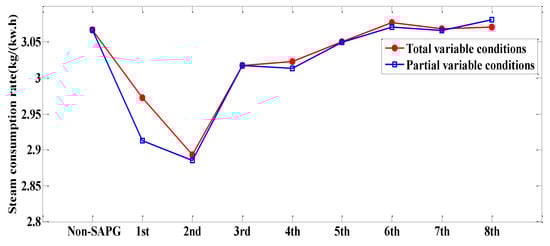 Table 1 shows the calculation results of thermal economy when different stages of extraction steam are replaced. The cycle thermal efficiency is 0.4587 and the heat consumption rate of the generation system is 8048.5 kJ/(kW·h); furthermore, the steam consumption rate of the generation system is 3.067 kJ/(kW·h) and the standard coal consumption rate of power generation is 303.4 g/(kW·h). As shown in Table 1, the SAPG system has a lower steam consumption rate and heat consumption rate than the original coal-fired power generation unit. This proves that the SAPG system plays a certain role in energy conservation and consumption reduction. The effect was the most obvious when replacing the second stage of steam extraction, the heat consumption rate of the generation system decreased by 5.2%, the steam consumption rate decreased by 5.9%, and the cycle thermal efficiency increased by 5.2%. The cycle Thermal efficiency of replacing the second stage is higher than that of replacing the first stage because the extraction steam of the second stage is greater than that of the first stage. With the increase of the substitution stage, the cycle thermal efficiency decreases, which indicates that, the higher the pressure of the substitution extraction, the higher the cycle thermal efficiency of the working fluid.