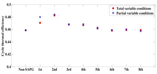 Based on a typical 600 MW coal-fired power generating unit, this section replaces eight stages of extraction steam respectively to explore the thermodynamic performance of the proposed SAPG system. Here, it is assumed that the direct solar radiation intensity is 800 W/m2, the ambient temperature is 291 K, and the specific enthalpy of other small steam remains unchanged. The thermal economy analysis is mainly concentrated on the cycle thermal efficiency of working fluid, the heat consumption rate of power generation, and the standard coal consumption rate of power generation.