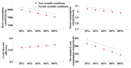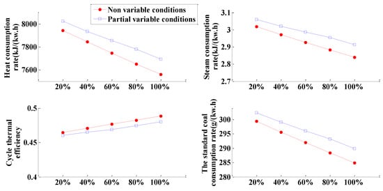 The analysis of Figure 10, Figure 11, Figure 12, Figure 13, Figure 14, Figure 15 and Figure 16 shows the following: (1) The results are compared with the original coal-fired units. When the 7th stage is replaced, the replacement steam extraction capacity is lower 80% than that of coal-fired units, and the cycle thermal efficiency is lower than that of coal-fired units. According to another formula of cycle thermal efficiency, , is the work done by condensing steam flow in the turbine, is the work done by extraction steam flow in the turbine, is the work done by leakage steam in the turbine, is the coefficient of reheat steam, is the specific enthalpy rise of reheat, and is the enthalpy value of feed water. This is because, when the amount of substituted steam extraction is small, the change of steam extraction pressure is small and slightly increases, that is, the extraction enthalpy value increases, and the drain water enthalpy value remains unchanged, so the drain water enthalpy rise remains unchanged. As a result, the amount of steam extraction decreases and the work of steam extraction decreases. The amount of extraction steam decreases, so the condensate steam increases and the condensate flow work increases, and remains the same. From the calculation results, the condensate flow () decreases compared with the original unit. increases, increases, decreases, and decreases under the action of these three; because the reduction is greater than the reduction, the cycle thermal efficiency decreases. (2) The more extraction steam substituted at each stage, the higher the cycle thermal efficiency and the better the energy conservation. (3) By comparing the non-variable conditions with partial variable conditions, the thermal economy errors of the 1st to 7th stages are within the allowable range of the project. Therefore, the partial variable conditions can be used to replace the calculation of total variable conditions when the thermal economy calculation of the 1st to 7th stages is substituted for the calculation of all variable conditions.