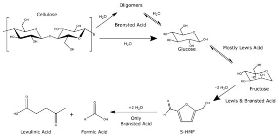 Heterogeneous solid acid catalysts have been proposed by several studies [,,] as replacements for H2SO4 and HCl mineral acids. Solid acid catalysts can significantly reduce equipment corrosion, lower the environmental impact and offer a more cost-effective catalyst separation method. Production of LA from monosaccharide sugars (e.g., glucose and fructose) and cellulose has been extensively studied with theoretical LA yields in excess of 50% with a broad range of solid acid catalysts including ion-exchange resins, metal oxides and modified zeolites [,,]. The acidic properties of some metal oxides can be further increased by sulphate doping in order to increase and tailor the number of Brønsted and Lewis acid sites, in order to catalyse each step of the levulinic acid formation mechanism shown in Figure 1 []. Additionally, widely used solid acids such as sulphated zirconia (SZR) catalyse the formation of LA from lignocellulose at significantly lower catalyst concentrations than mineral acids [,]. SZR displays both Lewis and Brønsted acidities, which are required for glucose isomerisation to fructose and subsequent dehydration to 5-HMF, respectively. SZR has been reported to convert both simple and complex carbohydrates into 5-HMF at high rates, 30–62% and 98% yields, respectively, as well as exhibiting great LA conversion rates from cellulose [,].