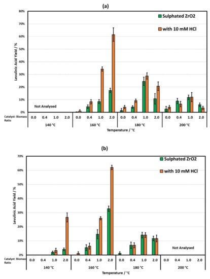 The SZR catalyst was initially investigated for the conversion of biomass to LA with deionised water between 140 and 200 °C for 60–120 min, as shown in Figure 2. The highest LA yield was 32% at 160 °C for 1 h in aqueous solution which was less than the literature LA yields with a similar sulphated catalyst with microcrystalline cellulose []. In this study, there was a negligible yield of a key intermediate of LA production, 5-HMF, which was previously reported as the bottleneck by Kassaye et al. with a similar sulphated zirconium []. Other zirconium-based catalysts with zirconia and zirconium phosphate reported LA yields of 53.9% and 52.9%, respectively, from microcrystalline cellulose with deionised water [,]. The reported yields in this study indicate that the heterogeneity and physical complexity of real lignocellulose reduce the solid–solid interaction compared with microcrystalline cellulose and are the cause of the decrease in LA between this study and the literature.