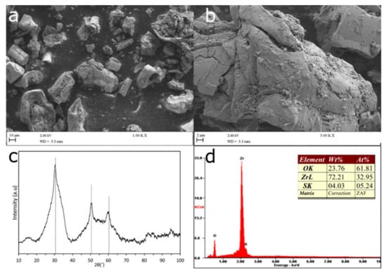 (a,b) SEM images of SZR catalyst; (c) XRD pattern of SZR; (d) EDX of SZR.