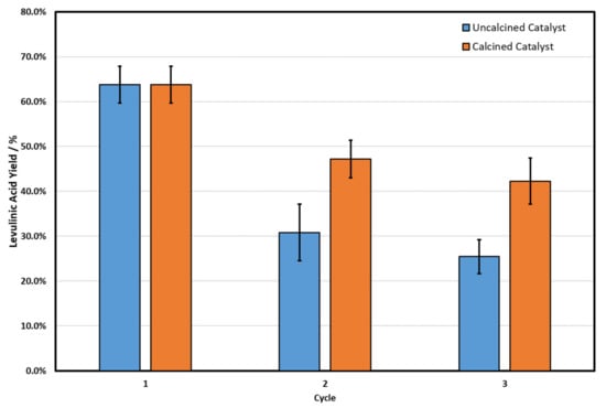 The catalyst recyclability is of utmost importance for the low-cost application production of LA with solid acid catalysts. The solid acid catalyst was mechanically separated from the solid residue through a 68 μm sieve which resulted in a 63% catalyst recovery (excluding 12% vs. catalyst contamination). The effects of calcination at 450 °C on catalyst reusability were investigated to understand both the possible catalyst deactivation mechanisms and to evaluate possible non-calcined catalyst recovery processes.