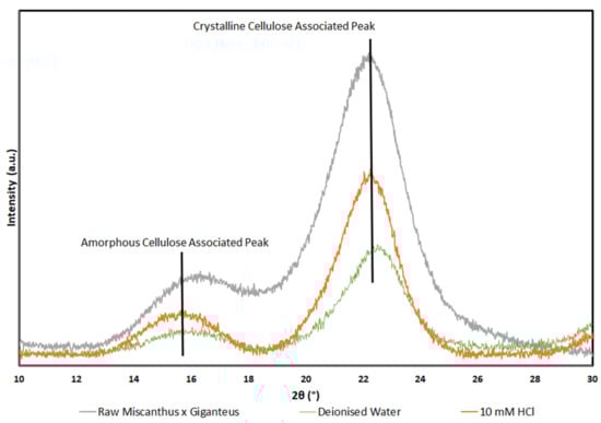 The SR produced during the catalysis with and without the addition of 10 mM HCl was analysed using X-ray diffraction (XRD) and compared with the raw biomass, as shown in Figure 5. The relative crystallinity of the raw biomass, solid residue from SZR in water medium and 10 mM HCl catalysis was 77.8%, 88.3% and 93.5%, respectively. This strongly suggests that the SZR favourably removes amorphous cellulose, which is in agreement with the effects of other solid acid catalysts in the literature []. The addition of 10 mM HCl significantly increases the degradation of amorphous cellulose compared to the water medium, which could be indicative of the role of trace HCl in cellulose depolymerisation. However, the crystallinity index is a relative ratio that cannot determine the absolute effect on both cellulose fractions.