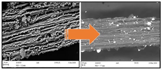 In order to understand the effect of humin formation compared to homogenous catalysts, the SR from the optimum conditions was compared to BIOFINE-like conditions previously investigated by our group, using SEM, as shown in Figure 6. It can be clearly seen how the carbonaceous spheres (humins) do not form when the reaction runs at the optimum conditions identified by the RSM model. We think the catalyst type is mainly responsible for this phenomenon, as the solid–solid interaction bottleneck for cellulose hydrolysis previously discussed also applies to humin formation. The heterogeneous catalyst reduces the number of active sites available for humin formation and humin growth by aldol polymerization. This was evident in all RSM combinations tested (non-optimum) which confirms this outcome, as there was no significant increase in residue yields at extreme conditions, indicating a minimal solid by-product-forming reaction, where humin deposition appears to shift from the residue towards the catalyst. The lack of structural change from the XRD analysis and lack of an obvious humin solid by-product confirm the previously mentioned high H/C and O/C ratios. This makes it obvious that the solid residue using sulphated catalysts, and possibly most heterogeneous catalysts, is more akin to the degraded biomass than the chars produced using homogenous catalysts such as sulphuric acid (Biofine process).