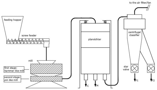 An industrial-scale device designed for milling and fractionating feedstock with a high dry matter content (>70%) was used to process the chips. Included was a two-stage mill: the first acts by impact, maximizing the number of impacts to achieve a significant breakage, and the second exerts strong shear actions (Figure 1) [30]. The milled material is then sieved through a plan sifter into three fractions, namely C (Coarse), M (Medium) and F (Fine). The fine fractions are further classified according to their dimensions, shape and density, into two fractions (named F1 and F2) through a centrifugal classifier (Table 1).