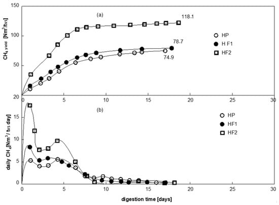 Biomethane yield of OF1 increased compared with the raw material (+26.7%), corresponding to a slight reduction of the C/N ratio, which was 101.5 vs. 110.7 of the feedstock. For HF1, the methane production was 78.7 Nm3 tVS−1 and there was no statistically significant difference compared to the raw material 69.4 Nm3 tVS−1; however, the production was significantly faster. The C/N ratio of HF1 was slightly higher than that of the raw material (78.2 vs. 66.9).