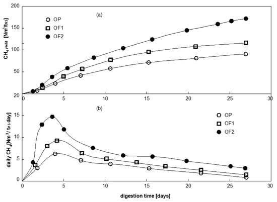 Cumulative methane yield of olive pruning and fraction OF1 and OF2 from processing (a) and daily methane yield (b).