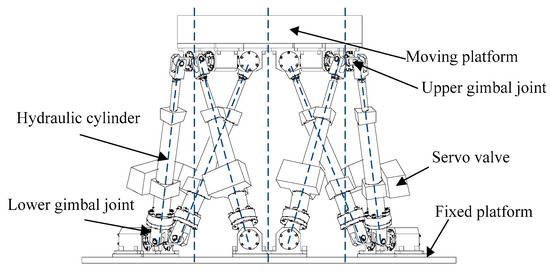 The hydraulic 6-DOF parallel mechanism is widely used in fields of flight training and motion simulation [12,13,14,15,16]. The upper limit of its dynamic characteristics is mainly determined by its natural frequencies of x and y degrees of freedom which are basically the same due to the symmetry of the mechanism and are the smallest in value among the total six rigid modes [17]. While in the previous hydraulic 6-DOF parallel mechanism projects, flexible modes appear that the actual natural frequencies of x and y degrees of freedom of the hydraulic 6-DOF parallel mechanism are lower than those obtained through calculation, which not only decreases the dynamic response characteristics of the mechanism, but also leads to a doubt about its actual performances. The phenomenon above can be observed from the bode diagram of the experimental 6-DOF parallel mechanism while further analysis is not conducted [18]. The structural flexibility of the hydraulic cylinder which is the main part of the parallel mechanism is studied, while further analysis has not been conducted due to the complex structure of the parallel mechanism [19,20]. The flexible modal phenomenon which the actual modal frequency is about 11.3 Hz compared with about 17 Hz through calculation is described and the transverse vibration of the hydraulic cylinder is roughly considered as the main reason by Li, but the above conclusion is only based on the equations of the transverse vibration of the hydraulic cylinder instead of the whole parallel mechanism [21]. So a complete 6-DOF parallel mechanism dynamic model considering the flexibility of the hydraulic cylinder should be established with verification of simulation and experiment to find the real reason of the flexible modes, which is conducted in this paper.