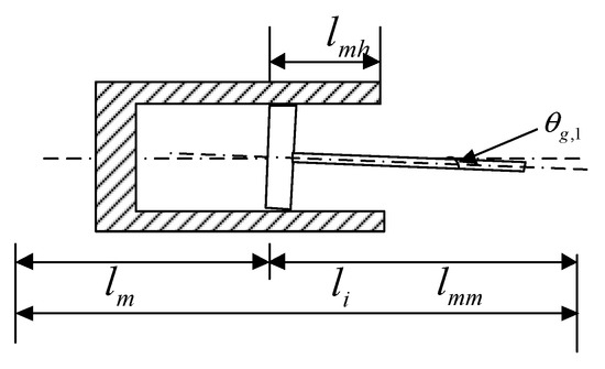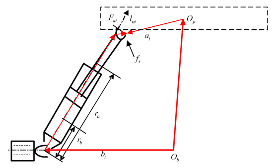 In Figure 3, li is the length of a single hydraulic leg, lm and lmn are the length from the piston to the lower gimbal joint and the length from the piston to the upper gimbal joint, lmh is the length from the guide sleeve to the piston, θg,1 is the rotation angle of the piston rod around the flexible axis 1. The schematic diagram of the i-th leg and the moving platform is shown in Figure 4, where is the position of the upper gimbal joint with respect to , is the constraint force applied by the upper gimbal joint, is the actuation force exerted by the piston rod. The extended Hamilton’s principle should be adopted to establish the dynamic model [23].