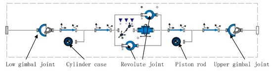 which provides the modal frequencies and the modes . It is worth noting that, for the rigid-flexible 6-DOF parallel mechanism, 18 modes can be obtained with Equation (17), while only six modes can be obtained with the rigid dynamic model. A simulation model is set, two revolute joints with torque spring are added in the cylinder model to imitate the effect of the O-rings of the guide sleeve, which are shown in Figure 5.