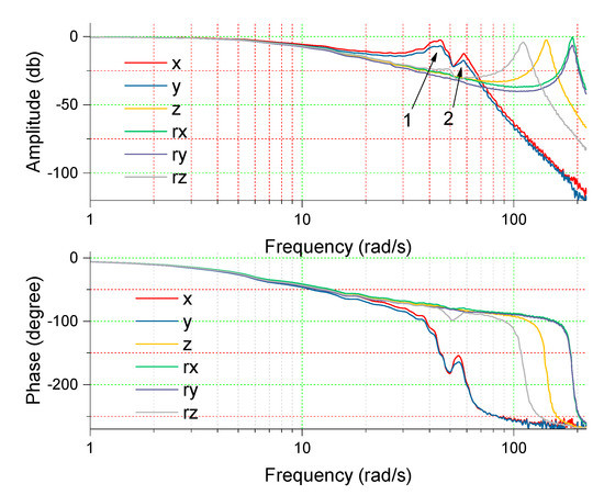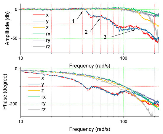 A real-time control system is used to control the experimental platform and to record the data. The position and pose of the experimental platform are calculated with the leg lengths which are acquired with a data sample card and the drive currents of the servo valves are obtained with the position and pose errors and a signal-conditioning module. The experimental process is illustrated as follows. First, move the moving platform to the middle position, then the complete bode diagram of the experimental platform can be obtained by exciting in all 6-DOF with white noise signals and Fourier transform next, which is shown in Figure 9.