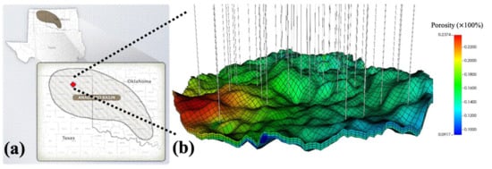 The 3D FWU reservoir model consists of 82 cells in the x-direction, 78 cells in the y-direction, and four cells in the z-direction, with a total of 25,584 grid blocks. Each grid block is 200 ft (or 60.96 m) by 200 ft (or 60.96 m) in x and y directions and about 8.67 ft (or 2.64 m) in the z-direction. This model only includes the Morrow B sandstone, as the integrity of the overlying Thirteen Finger limestone will not be compromised for at least 5000 years [31]. A total of 55 wells (23 injectors and 32 producers) were distributed across the model domain in 5-spot patterns (Figure 1b). This reservoir model has been calibrated with the FWU field history by the SWP [34,42]. Well schedules include a 10-year CO2-EOR period, a subsequent 10-year post-EOR CO2 injection period, and another 580-year monitoring period. In the CO2-EOR period, CO2 and water were alternatively injected (water alternating gas (WAG)), reflecting the site history. In the post-EOR CO2 injection period, all producers were shut-in, and CO2 was continuously injected at 5 106 ft3/day (or 1.42 105 m3/day) through all injectors. In the monitoring period, all wells were shut-in, and no CO2 was injected into the model. The heterogeneous porosity and permeability distributions of the reservoir model were derived from the site characterization and geostatistical analysis of previous SWP work. Figure 1b presents the heterogeneous porosity distribution of the 3D FWU model and the locations of the wells.